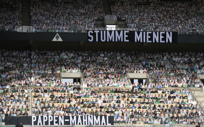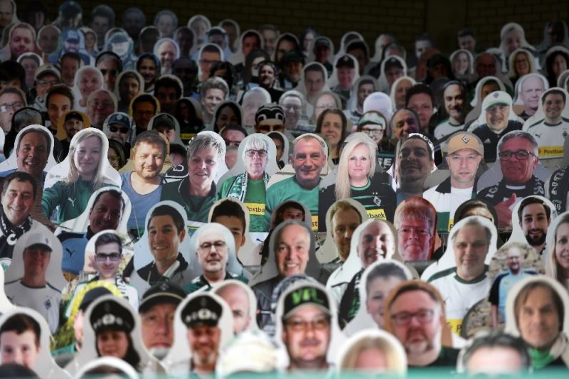 Korona virüs nedeniyle seyircisiz oynanan Mönchengladbach-Bayer Leverkusen karşılaşmasında tribünlere yaklaşık 13 bin taraftarın kartondan fotoğrafı yerleştirildi.