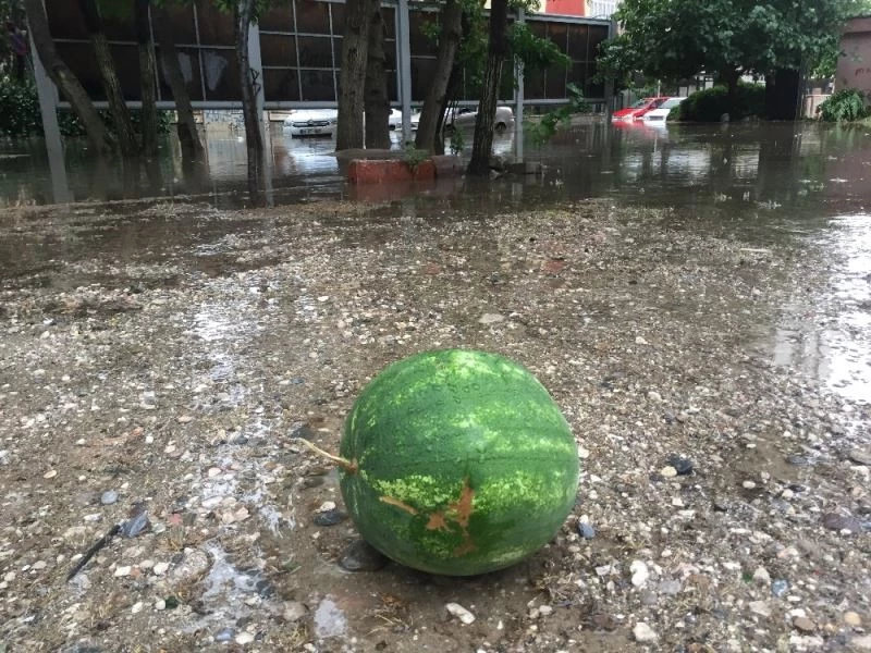 Adana’da 4 bin lira borçla satın alıp kaldırımda satan seyyar satıcının karpuzları, dün aniden bastıran şiddetli yağmurda sele kapılıp gitti.