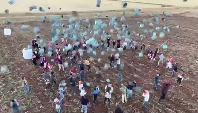 Şanlıurfa’nın Hilvan ilçesinden Sivas’ın Kangal ilçesine patates toplamaya giden mevsimlik tarım işçileri sezonu kovaları fırlatarak kapattı.