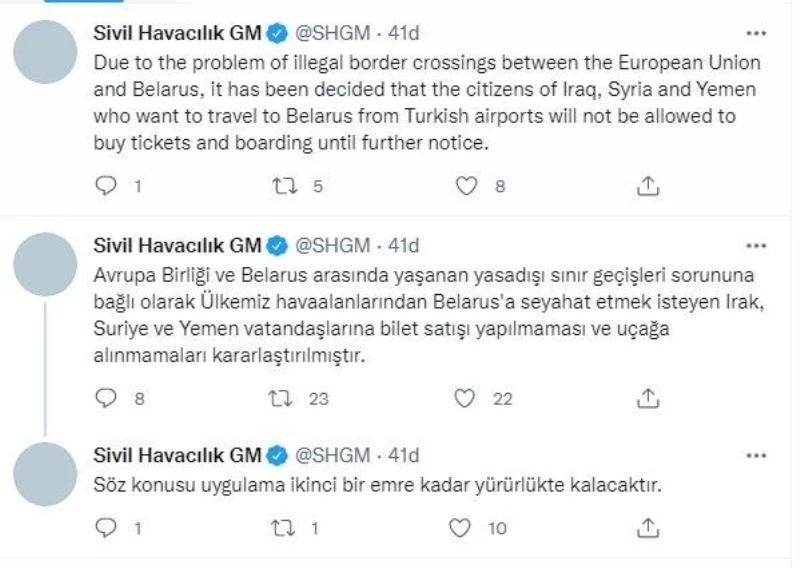 Sivil Havacılık Genel Müdürlüğü’nün resmi Twitter hesabından konuya ilişkin yapılan duyuruda, “Avrupa Birliği ve Belarus arasında yaşanan yasadışı sınır geçişleri sorununa bağlı olarak ülkemiz havaalanlarından Belarus’a seyahat etmek isteyen Irak, Suriye ve Yemen vatandaşlarına bilet satışı yapılmaması ve uçağa alınmamaları kararlaştırılmıştır. Söz konusu uygulama ikinci bir emre kadar yürürlükte kalacaktır” ifadelerine yer verildi.
