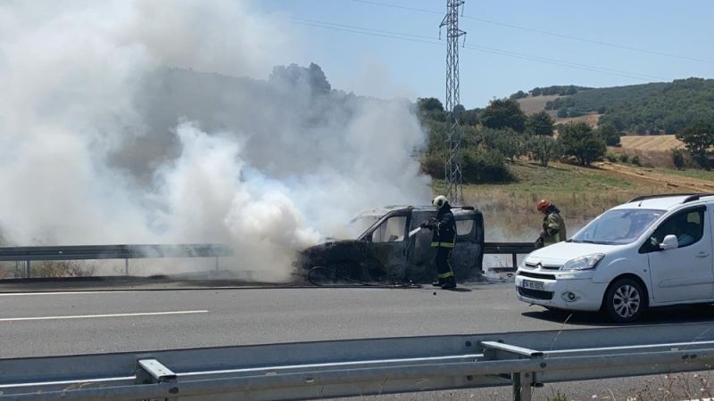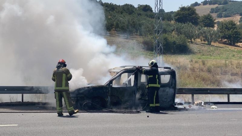 Bursa’da sıcak havada hareket halindeki araç biranda alev aldı. İçinde 4 kişilik ailenin bulunduğu araç tamamen yandı.
