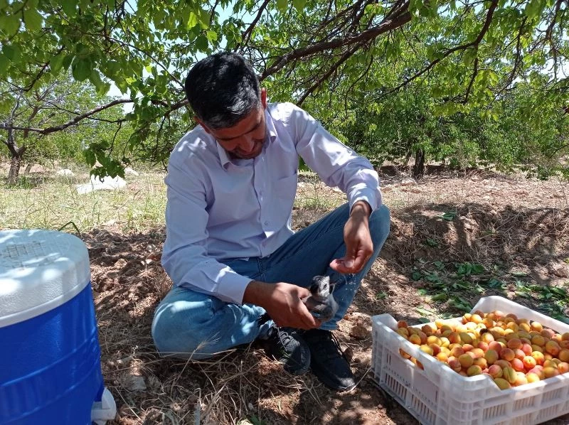 Çiftçi Bilal Korkmaz, yavru kargaya elleriyle su içirdiğini belirterek, “Kayısı topluyorduk, yavru yuvadan düşmüş. Su verdik ve tekrar yerine bırakacağız. Hayvan susamıştı. Ellerimizle su içirdik. Doydu, sıcaktan baygınlık geçiriyor” diye konuştu.