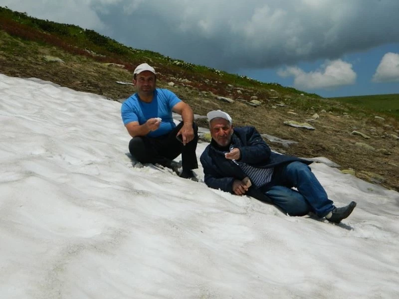 Ardahan’da hava sıcaklıklarının artış göstermesiyle beraber sıcaktan bunalan vatandaşlar, yaylada gölge alanda kalan karla serinlemeye çalışıyorlar.