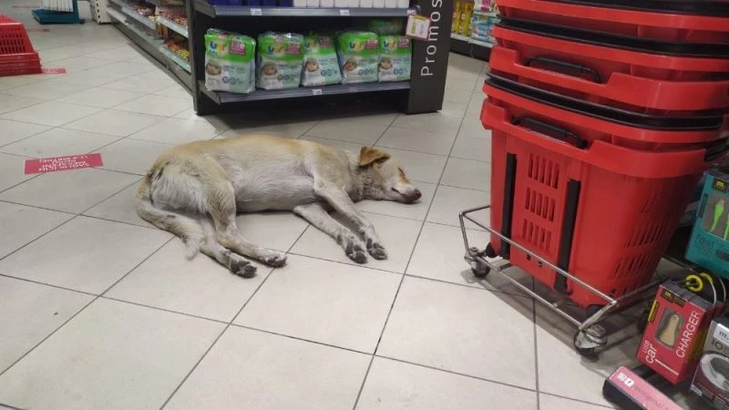 Termometrelerin 34 ile 38 derecelerde olduğu Denizli’de, insanlar kadar sokak hayvanları da sıcaktan bunalarak, serinlemek için yer arıyor. Dışarıda güneşten ve sıcak havadan bunalan bir sokak köpeği serinlemek için bir markete girdi. Çevresinde olup bitene aldırış etmeden rafların arasına uzanan ve uykuya dalan sokak köpeği müşteriler tarafından görüntülendi. Merkezefendi ilçesinde bir markete sürekli olarak geldiği öğrenildi. Market çalışanları köpeğin sıcak havalarda serinlediğini, soğuk havalarda ise ısınmak için içeriye girdiğini söyledi. İsmini belirtmek istemeyen işletme sahibi, "Müşteriler gördüğünde hem fotoğraf çekiyor, hemde içeride köpeğe izin verdiğimiz için çalışanlara ve bizlere teşekkür ederek memnuniyetle ayrılıyor. Kışın ise bazen kediler ısınmak için kapının önüne geliyor ve bizde içeriye alıyoruz" dedi.