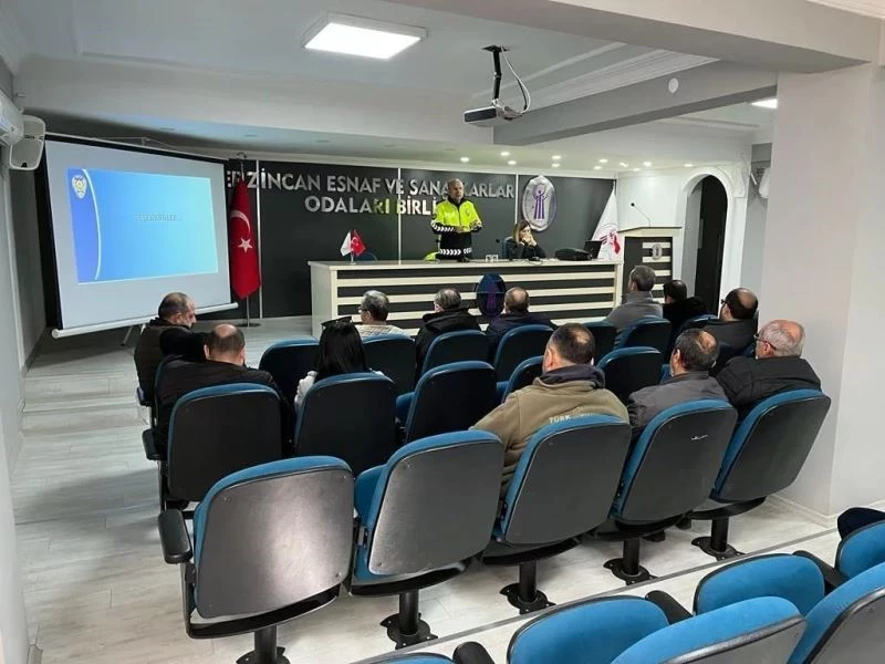 Erzincan’da meydana gelen maddi hasarlı trafik kazalarında, sürücülerin maddi hasarlı trafik kaza raporunu kendilerinin düzenlemelerine yönelik kamuoyunda farkındalık oluşturmak ve güvenli trafik ortamının oluşmasına katkı sağlamak amacıyla, İl Emniyet Müdürlüğü Trafik Tescil ve Denetleme Şube Müdürlüğünce, Erzincan Esnaf ve Sanatkarlar Odaları Birliği Toplantı Salonu’nda, 9 sigorta acentesi sahibi/temsilcisi ve 28 ticari araç şoförüne, maddi hasarlı trafik kaza tutanağı düzenleme ve trafik güvenliği konularında eğitim verildi.