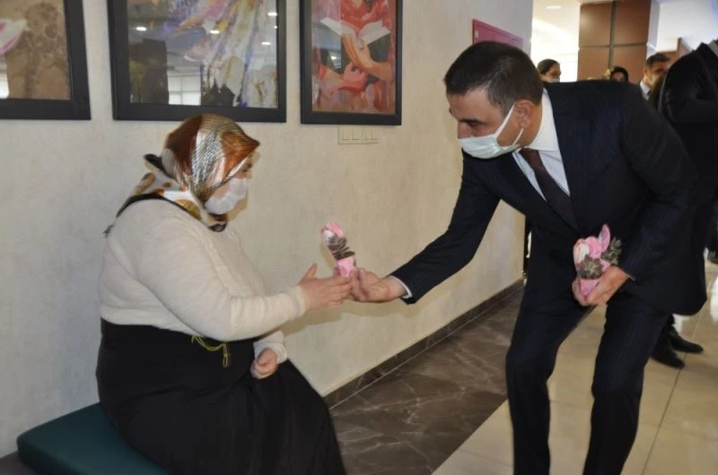 Vali ve Belediye Başkan Vekili Hacıbektaşoğlu, sergiyi gezerek, ilgililerden çalışmalar hakkında bilgi aldı. Kadınlara karanfil dağıtan Vali Hacıbektaşoğlu, kadınların günlerini kutladı. Kadınlarımızın hayatımızın her alanında var olması, güçlenmesi ve sesini duyurması, ülkemizin hedeflerine ulaşmasının garantisi olduğunu belirten Vali Hacıbektaşoğlu, insani hasletlerin timsali olan kadınlarımız ve annelerimiz daima özverinin, sevginin ve yetiştirdikleri nesillerle zengin medeniyetimizin oluşum kaynağı olduklarını söyledi. Hacıbektaşoğlu, “Peygamber Efendimizin (SAV) ‘Cennet annelerin ayakları altındadır’ sözüyle; yüce dinimizin özellikle anne olan kadına ne kadar önem ve saygınlık verdiğini göstermiştir. Kadınlarımızın maruz kaldığı şiddet olayları hepimizi derinden üzmekte ve toplumumuzu yaralamaktadır. Bir insanlık suçu olarak gördüğümüz kadına yönelik her türlü fiziki ve ruhsal şiddeti kınıyorum. Bu kapsamda ilgili kurumlar, sivil toplum kuruluşları ve bütün bireylere önemli görev ve sorumluluklar düşmektedir. Devletimiz, bütün kurum ve kuruluşlarıyla her daim kadınlarımızın yanındadır. Bu duygularla, başta şehit ve gazi anneleri olmak üzere sevginin, şefkatin ve hoşgörünün kaynağı olmuş tüm kadınlarımızın ‘8 Mart Dünya Kadınlar Günü’nü kutlar, sağlık, mutluluk ve başarılar dilerim” dedi.