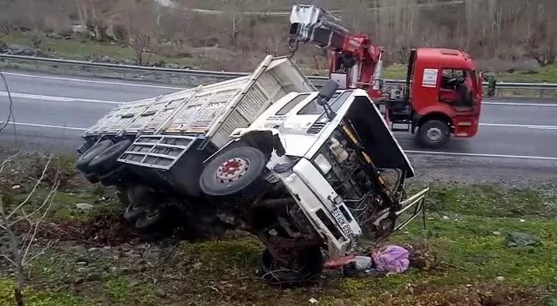 Kamyon çekici yardımıyla devrildiği yerden çıkarılırken, kazayla ilgili inceleme başlatıldı.