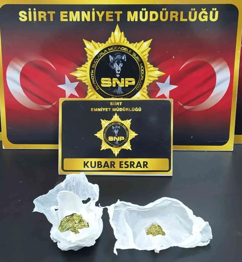 Siirt İl Emniyet Müdürlüğü Narkotik Suçlarla Mücadele Şube Müdürlüğü ekiplerince, uyuşturucu veya uyarıcı madde imal ve ticareti yapma veya sağlama ve kullanma suçlarının önlenmesi maksadıyla başlatılan çalışmalar devam ediyor. Çalışmalar kapsamında, kent merkezi Cezaevi Kavşağında durumundan şüphelenerek durdurulan bir araç içerisinde bulunan bir şahıstan 2 adet paket halinde toplam 15,72 gram kubar esrar maddesi ele geçirildi.