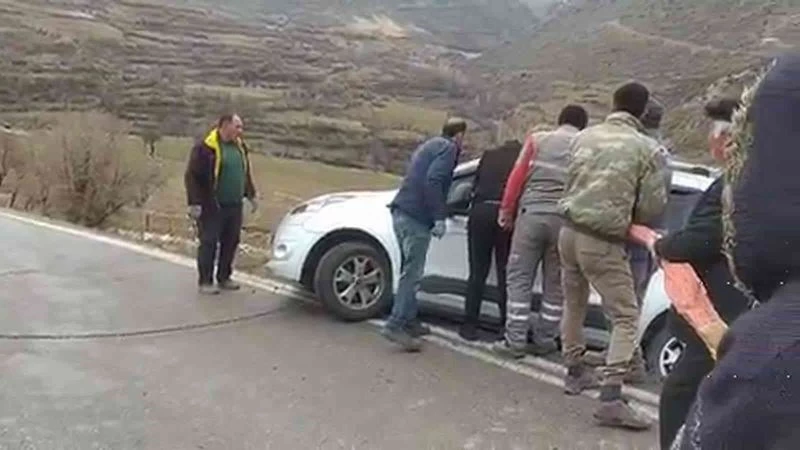 Edinilen bilgilere göre, Siirt Eruh karayolunda meydana geldi. M.O. yönetimindeki araç kayganlaşan yolda sürücüsünün direksiyon hakimiyetini kaybetmesi sonucu yol kenarında asılı kaldı. Yol kenarında asılı kalan araç sürücüsü ve yanındaki kişiler indi. Aracın şarampole yuvarlanma ihtimaline karşı vatandaşlardan yardım istendi. İş makinesine halat ile bağlanan araç, uzun uğraşlar sonucu vatandaşların da yardımıyla asılı kaldığı yerden yola çekildi. Sürücü M.O. yardıma gelen vatandaşlara teşekkür etti.