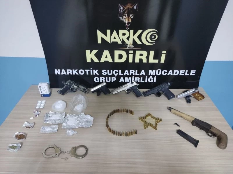 Adreste yapılan aramalarda 4 adet 7.65 mm ruhsatsız tabanca, 1 adet kurusıkı tabanca, 1 adet tüfek, 31 adet 9 mm fişek, 33 adet 7.65 mm fişek, 6 adet şarjör, 61.6 gram metamfetamin, 2 gr sentetik kannabinoit, 1.6 gram esrar, 16 adet uyuşturucu hap, 1 adet kelepçe ele geçirildi.
