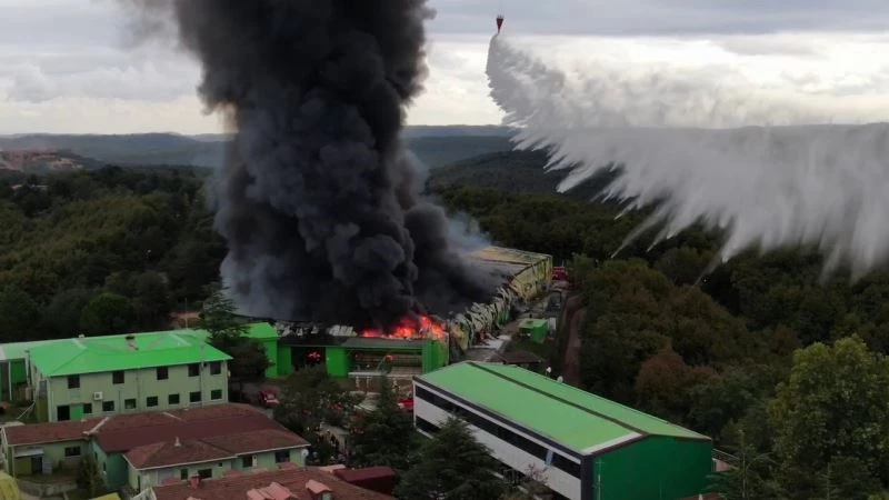 Şile’de alevlere teslim olan fabrika havadan görüntülendi