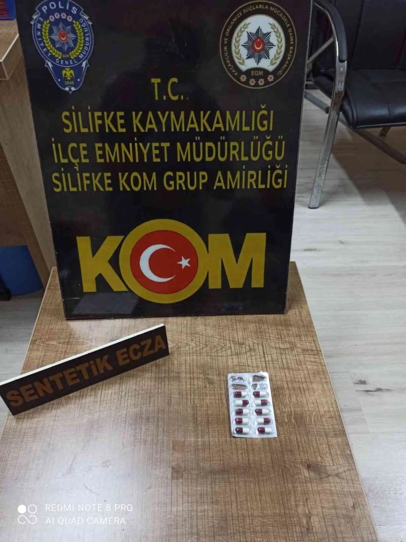 İl Emniyet Müdürlüğünden yapılan açıklamaya göre, Silifke İlçe Emniyet Müdürlüğü KOM Grup Amirliğince yapılan çalışmada, M.M. adlı şüpheli, 2 şahsa 2 adet sentetik hap sattığı sırada suçüstü yakalandı. Şüphelinin evinde yapılan aramada 10 adet daha uyuşturucu nitelikli hap ele geçirildi. Zanlı, ’uyuşturucu madde ticareti’ yapmak suçundan sevk edildiği mahkemece tutuklanırken, hapları satın alan 2 şahsa ise ’uyuşturucu madde kullanmak’ suçundan işlem yapıldı.
