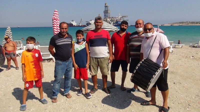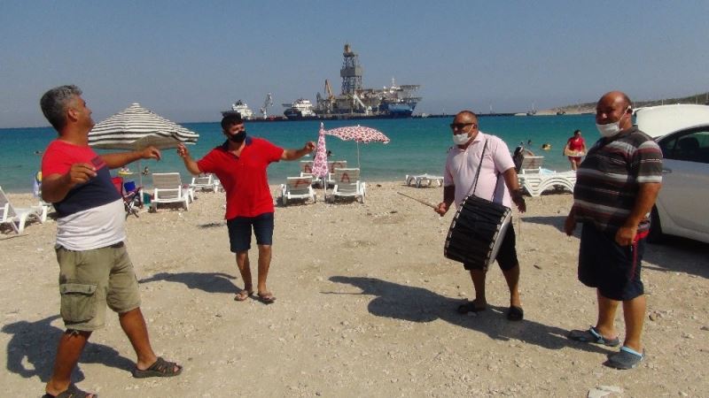 Sahilde güneşlenen ve yüzen insanlarla birlikte sevinçlerini paylaşan Silifkeliler, Kanuni Sondaj Gemisindeki çalışanlara seslerini duyurmak ve sevinçlerine ortak olmak için davul çalıp, göbek attılar.
