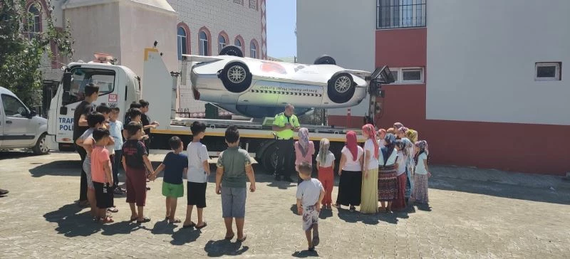 Mersin Trafik Denetleme Şube Müdürlüğü ekipleri, eğitim gören bekçilere ve yaz Kur’an kursu öğrencilerine simülasyon aracı ile emniyet kemeri eğitim verdi.