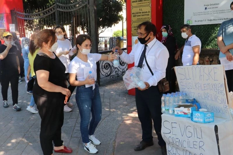 Sınava giren adaylara destek olmak için ücretsiz maske, su ve sakız dağıttı