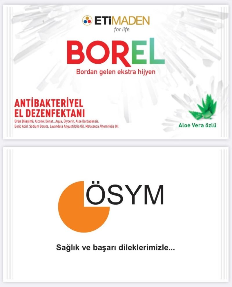 Cumhurbaşkanı Recep Tayyip Erdoğan’ın talimatıyla seri üretimine geçilen ve bugüne kadar milyonlarca adet satılan borlu antibakteriyel el dezenfektanı BOREL, şimdi de ÖSYM’nin yapacağı sınavlarda öğrencileri virüsten koruyacak.