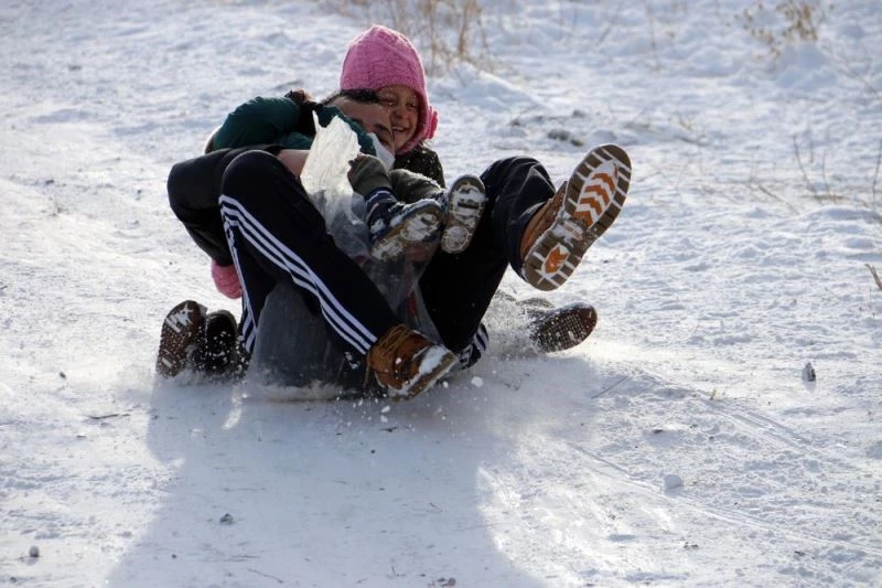 Kızlı erkekli onlarca çocuk Karşıyaka mahallesinin doğal pist sahası olan boş arazide evlerinden getirdikleri poşetlerle, plastik çantalarla ve bidonlardan kesilen parçaları kendilerine kızak yaparak saatlerce eğlendi.
