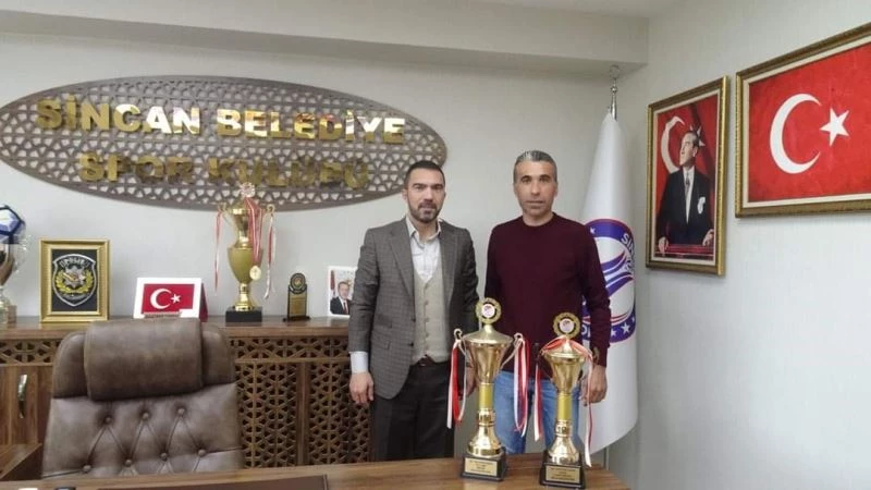 Sincan Belediyespor alt yapı sorumlusu Bülent Şen şampiyonluk kupalarını Kulüp Başkanı Süleyman Tarman’ı ziyaret ederek takdim etti. Tarman “Bülent Hocamız nezdinde, Tayfun, Serkan ve Yusuf Hocalarımıza ve gurur kaynağımız sporcularımıza teşekkür ediyorum” dedi.