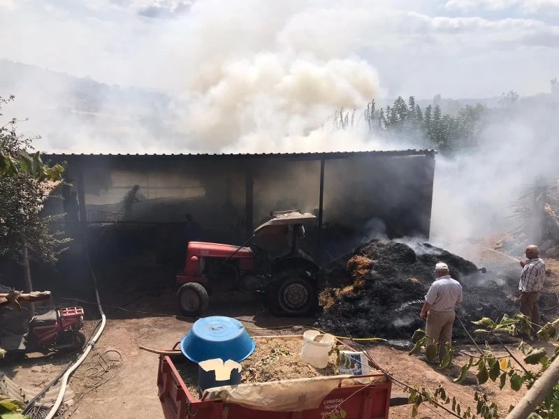 Balıkesir’in Sındırgı ilçesinin Kocabey kırsal mahallesinde öğle saatlerinde çıkan yangında saman deposu ve içinde bulunan traktör kullanılamaz hale geldi.