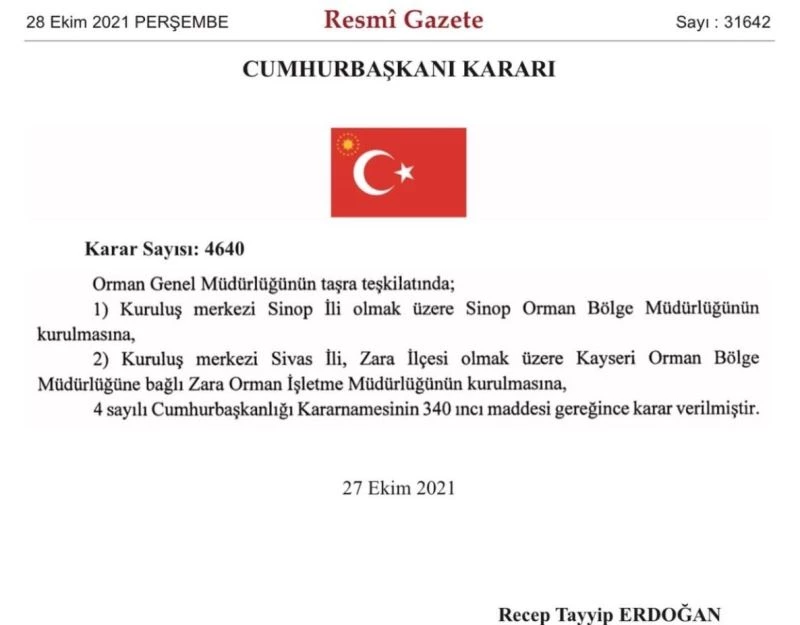 Sinop Orman Bölge Müdürlüğü’nün kurulmasına dair Cumhurbaşkanı Kararı 28 Ekim 2021 Tarih ve 31642 Sayılı Resmi Gazete’de yayımlandı.