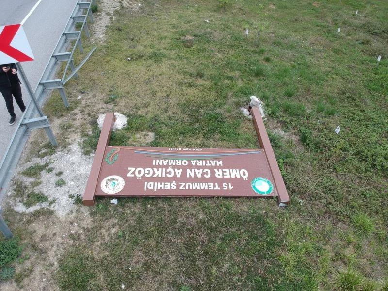 Sinop-Samsun karayolu Yenikent mevkisinde bulunan “15 Temmuz Şehidi Ömer Can Açıkgöz Hatıra Ormanı”nın tabelası rüzgarın etkisiyle yıkılmış durumda.