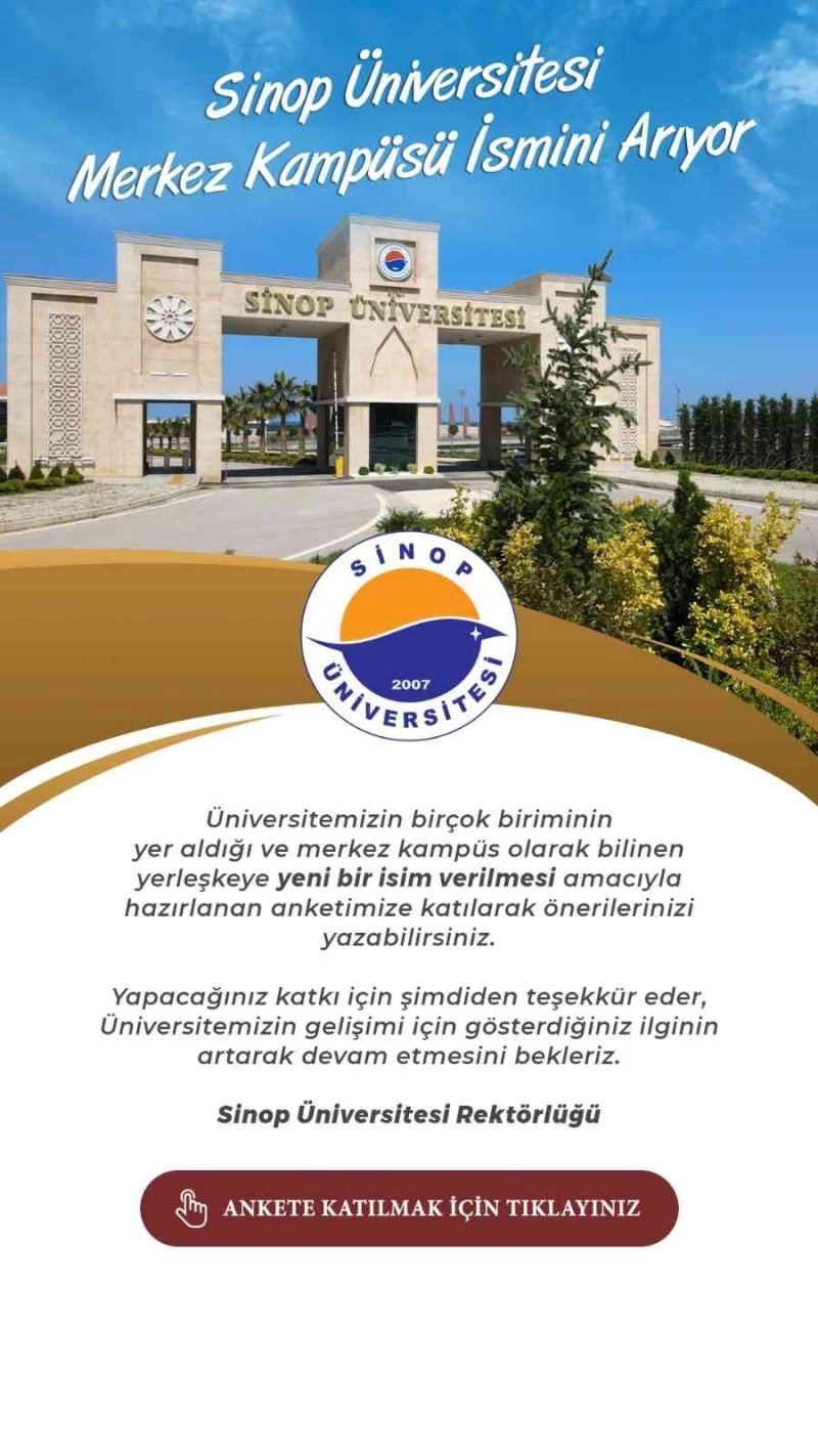 Sinop Üniversitesi’nden yapılan açıklamada, “Üniversitemizin birçok biriminin yer aldığı ve merkez kampüs olarak bilinen yerleşkeye yeni bir isim verilmesi amacıyla hazırlanan anketimize katılarak önerilerinizi yazabilirsiniz. Yapacağınız katkı için şimdiden teşekkür eder, üniversitemizin gelişimi için gösterdiğiniz ilginin artarak devam etmesini bekleriz” ifadelerine yer verildi.