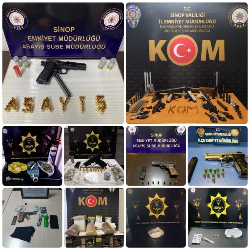 Sinop İl Emniyet Müdürlüğü tarafından 2022 yılı Kasım ayı raporu yayımlandı. Yapılan açıklamaya göre, 42 aranan şahıs yakalandı, 16 şahıs tutuklandı, 16 adet ruhsatsız tabanca, 1 adet tüfek, 5 adet fişek,184 adet mermi, 68 bin 400 adet makaron, 20 kg kıyılmış tütün, 111,91 gr metamfetamin, 69,67 gr esrar, 30 adet sentetik ecza maddesi ele geçirildi.