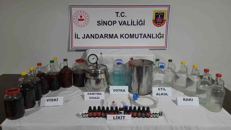 Edinilen bilgiye göre, Sinop İl Jandarma Komutanlığı ekiplerince ‘bağımlılıkla mücadele’ çalışmaları çerçevesinde Durağan ilçesinde yapılan istihbari çalışmalarda, kaçak alkol üretimi yaptığı tespit edilen bir kişinin evinin bahçesindeki barakaya baskın düzenlendi. Yapılan incelemelerde şişeler içerisinde hazırlanmış 36 litre viski, 22 litre rakı, 4,5 litre votka olmak üzere toplam 62,5 litre ev yapımı alkol piyasaya sürülmeden ele geçirildi. Ayrıca, odalarda 1 litre etil alkol, likit aroma, anason yağı ve damıtma aleti de ele geçirildi.