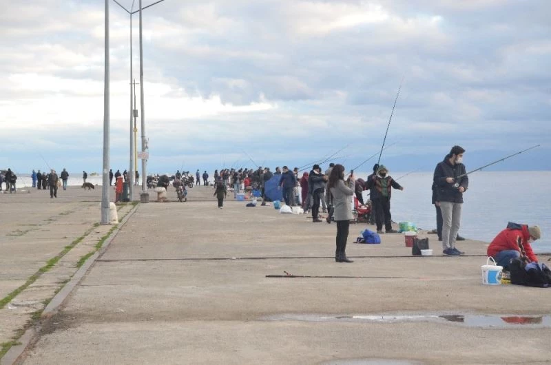 Sinop’ta amatör balıkçılar iskelede kovalarını ağzına kadar balıkla doldurdu.