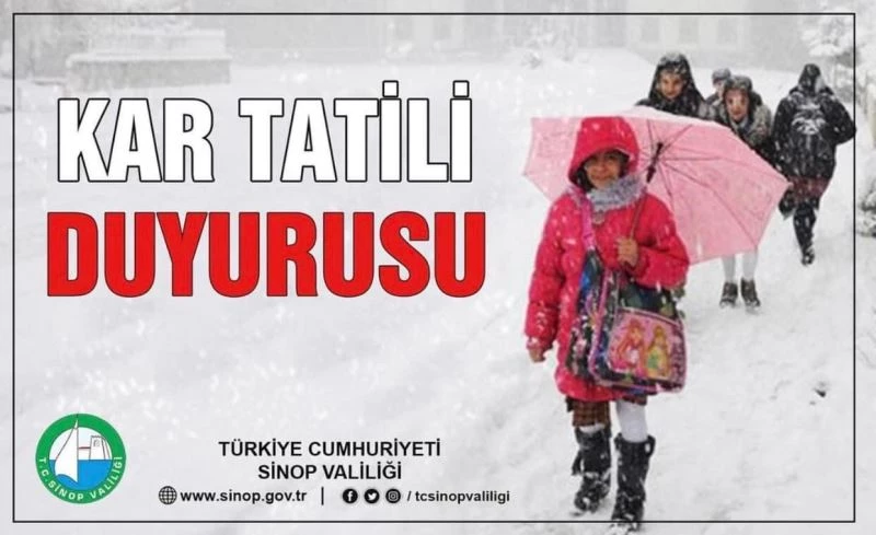 Sinop Valiliği’nden yapılan açıklamada, “Meteorolojik verilere göre ilimiz genelinde etkili olması beklenen yoğun kar yağışı nedeniyle ilimiz ve tüm ilçelerimizde 11 Mart 2022 tarihinde tüm resmi ve özel okullarda, özel eğitim kurumlarında, halk eğitim kurslarında, özel öğretim kurslarında, eğitim-öğretime 1 gün ara verilmiştir. Kamu kurum ve kuruluşlarında çalışan hamile ve engelli çalışanlarımız bir gün süre ile idari izinli sayılacaklardır” denildi.
