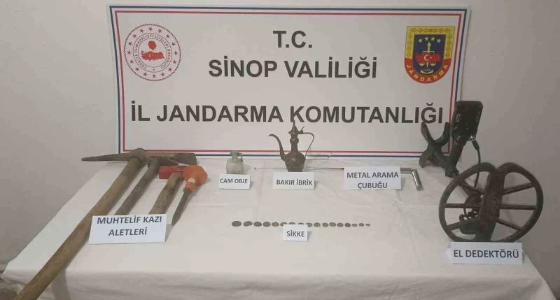 Edinilen bilgiye göre, dün jandarma ekiplerince Boyabat ilçesinde tarihi eser aramak için kaçak kazı yaptığı öğrenilen bir kişiye suçüstü yapıldı. Kazılarda elde ettiği 1 bakır ibrik, 1 cam vazo ile Helenistik döneme ait 17 sikke ile kazıda kullanılan detektör ve aletler ele geçirildi. Gözaltına alınan 1 kişi hakkında yasal işlem başlatıldı.