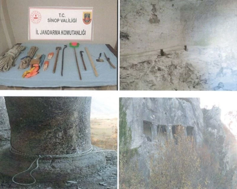 Sinop’un Durağan ilçesi Köklen köyü Terelek Kaya Mezarları mevkiinde bulunan Anıt Kaya Mezarlarının bulunduğu bölgede kaçak kazı yapan 4 şahıs Jandarma ekipleri tarafından suçüstü yakalandı.