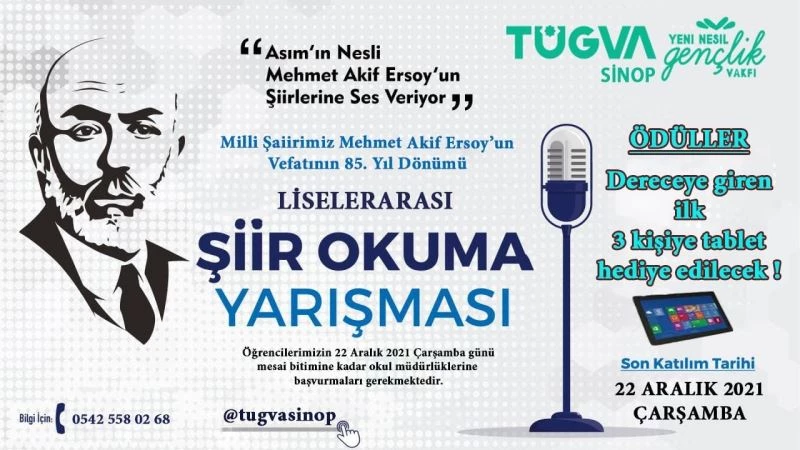 Liseler arası düzenlenen şiir okuma yarışmasında dereceye giren ilk üç öğrenciye tablet, ilk on öğrenciye ise çeşitli hediyeler verilecek. Konuya ilişkin açıklama yapan TÜGVA Sinop İl Temsilcisi Yusuf Çakır, Milli Şair Mehmet Akif Ersoy’u vefatının 85. yıl dönümünde rahmetle andıklarını belirterek, düzenlenen yarışmaya tüm lise öğrencilerini davet etti.
