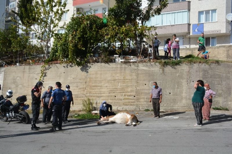 Ada Mahallesi Cantug Blokları’nın önündeki yeşillik alanda otlayan büyükbaş hayvan, 3 metrelik beton zeminden yola düştü. İneğin düştüğünü gören çevre sakinleri durumu belediye ve polis ekiplerine bilirdi. Olay yerine gelen polis ekipleri yaralı ineğin sahibine ulaşmaya çalıştı. Sahibine ulaşılamayan inek saatlerce güneşin altında yol ortasında can çekişerek ölüme terk edildi. Mahalle sakinleri can çekişen ineğe su vererek hayatta tutmaya çalıştı.