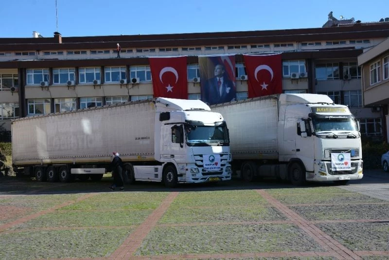 Sinop Valiliği tarafından İzmir depreminde zarar gören aileler için düzenlenen yardım kampanyası kapsamında toplanan 2 tır dolusu yardım, valilik önünde düzenlenen törenle uğurlandı.