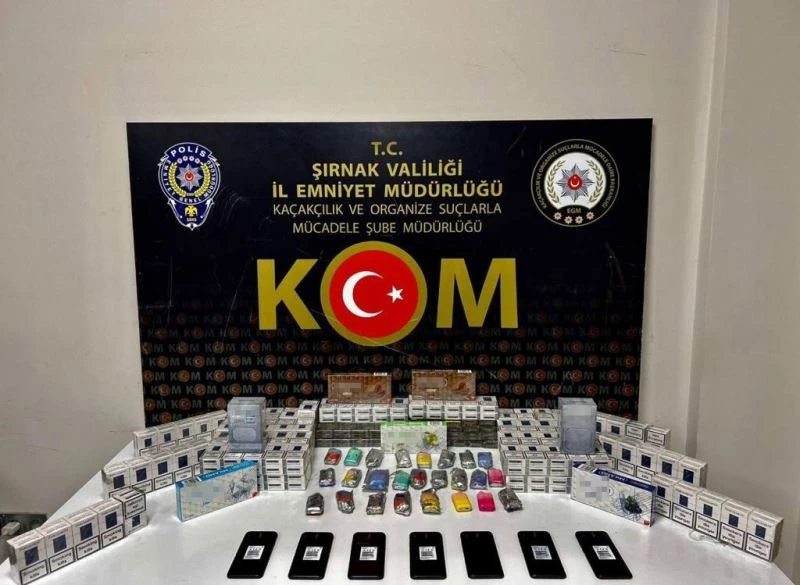 Şırnak ve Habur Sınır Kapısında yapılan operasyonlarda, 2,74 gram metamfetamin, 61,90 gram esrar, 0,85 gram eroin, 94 adet bong, 260 bin adet makaron, 831 paket sigara, 93 adet elektronik emtia, 30 adet muhtelif emtia, 14 paket elektronik sigara tütünü, 11 adet cep telefonu aksesuarı, 9 litre kaçak içki, 7 adet cep telefonu ele geçirildi.
