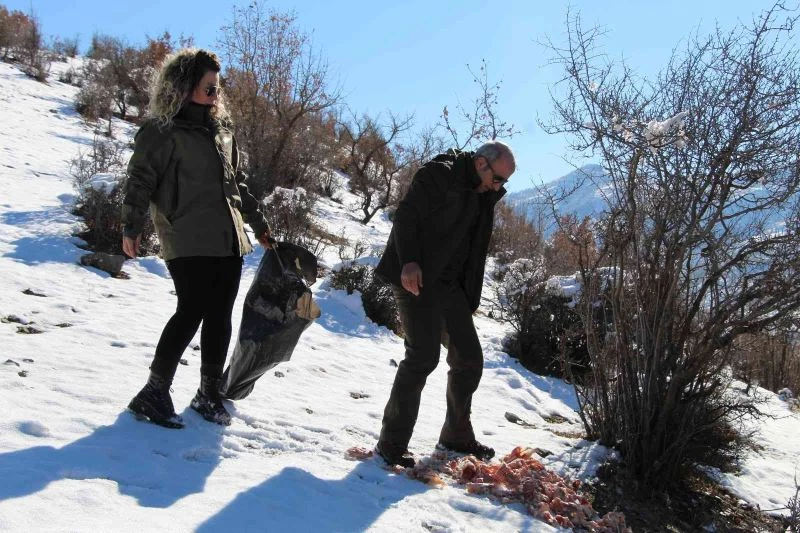 Şube Müdürü Kalay, Doğa Koruma ve Milli Parklar Şırnak Şube Müdürlüğü olarak her sene olduğu gibi bu senede yemleme çalışmasını yoğun kış şartlarına bağlı olarak başlattıklarını söyledi. Bu sene de kış mevsimi başlamasıyla beraber manavlardan, pazarlardan, fırın ve marketlerden toplamış oldukları atık yiyecekleri, kırık buğday, kırık arpa, ekmek, yeşillik, meyve ve sebze atıklarını yem bulmakta zorlanan yaban hayvanları için doğada belirli alanlara bıraktıklarını belirten Kalay, “Yaklaşık 3 ay boyunca yoğun kış şartlarının devam ettiği alanlara yemleme çalışmasını devam ettireceğiz. Amacımız yem bulmak için yaban hayvanlarımızın yerleşim alanlarına inmelerini engellemek. Bulundukları doğal ortamlarında yem bulmalarını sağlamak. Bıraktığımız yemleri genelde yırtıcı kuşlar, çakal, kurt, geyik ve tilki, kınalı keklik, tavşan ve yaban domuzu gibi yaban hayvanlarımız için yem bırakıyoruz” dedi.