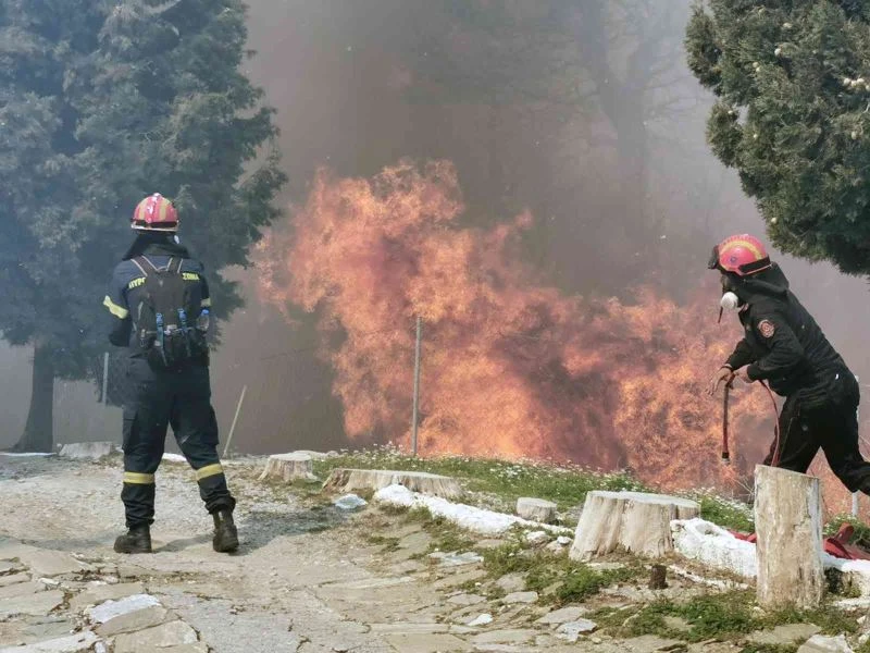 Adadaki yangının yerleşim birimlerine yaklaşması sonrası Vourliotes köyünün tedbir amaçlı boşaltıldığı öğrenildi. Karadan itfaiye ekiplerinin müdahalesi sürüyor.