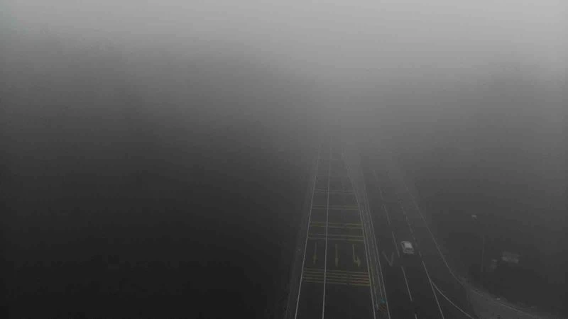 Bolu Dağı’nda sabah saatlerinden itibaren etkili olan ve görüş mesafesini 20 metreye kadar düşüren yoğun sis, havadan görüntülendi.