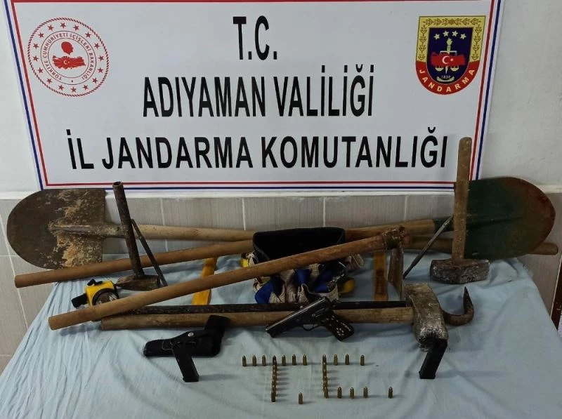 Kazı alanında yapılan şahıslarla birlikte 2 adet çekiç, 1 adet manila, 2 adet matkap ucu, 1 adet halat, 1 adet fener, 2 adet kürek, 1 adet kazma, 1 adet tabanca, 2 adet şarjör, 27 adet fişek ele geçirildi.
