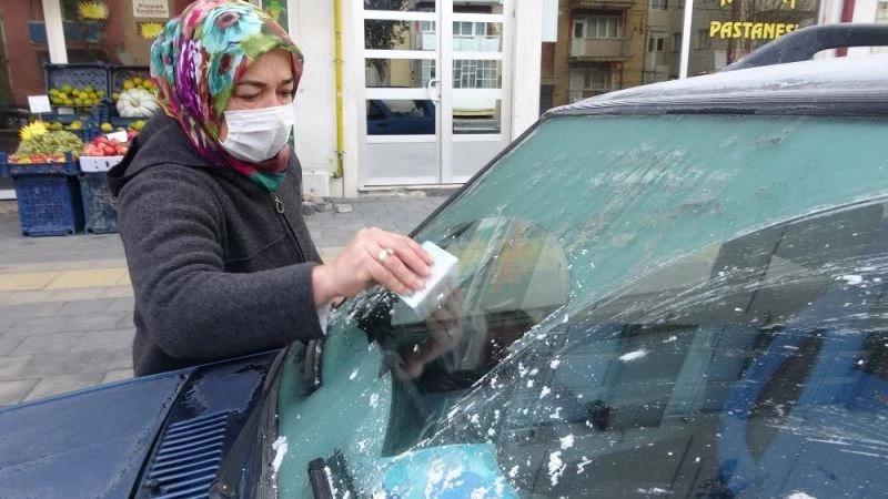 Sivas’ta sabah saatlerinde termometreler eksi 3 dereceyi gösterirken, arabaların camları buz tuttu.