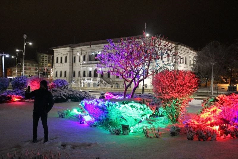 Sivas’ta akşam saatlerinde etkili olan kar yağışı kenti adeta beyaza bürürken ortaya ise kartpostallık görüntüler çıktı.