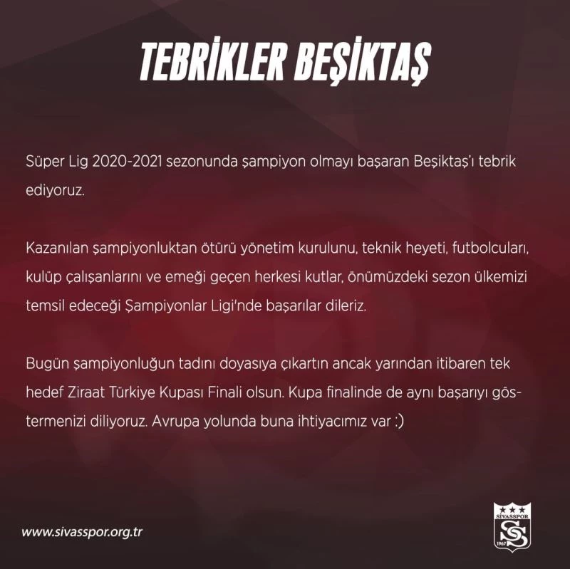 Sivasspor’un, sosyal medya hesabından yaptığı paylaşımda, "Süper Lig 2020-2021 sezonunda şampiyon olmayı başaran Beşiktaş’ı tebrik ediyoruz. Kazanılan şampiyonluktan ötürü yönetim kurulunu, teknik heyeti, futbolcuları, kulüp çalışanlarını ve emeği geçen herkesi kutlar, önümüzdeki sezon ülkemizi temsil edeceği Şampiyonlar Ligi’nde başarılar dileriz.