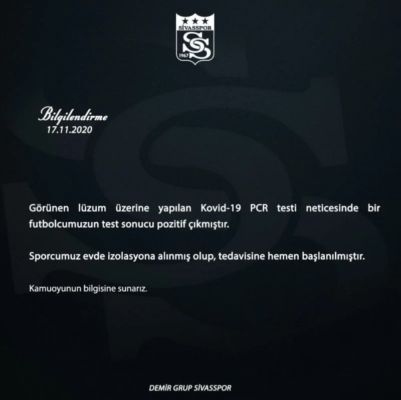 Öte yandan Sivasspor Kulübü, geçtiğimiz günlerde 2 futbolcunun korona testlerinin pozitif çıktığını duyurmuştu.