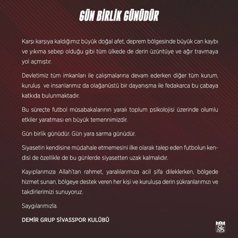 Sivasspor’dan yapılan yazılı açıklamada, "Karşı karşıya kaldığımız büyük doğal afet, deprem bölgesinde büyük can kaybı ve yıkıma sebep olduğu gibi tüm ülkede de derin üzüntüye ve ağır travmaya yol açmıştır. Devletimiz tüm imkanları ile çalışmalarına devam ederken diğer tüm kurum, kuruluş ve insanlarımız da olağanüstü bir dayanışma ile fedakarca bu çabaya katkıda bulunmaktadır. Bu süreçte futbol müsabakalarının yaralı toplum psikolojisi üzerinde olumlu etkiler oluşturması en büyük temennimizdir. Gün birlik günüdür. Gün yara sarma günüdür. Siyasetin kendisine müdahale etmemesini ilke olarak talep eden futbolun kendisi de özellikle de bu günlerde siyasetten uzak kalmalıdır. Kayıplarımıza Allah’tan rahmet, yaralılarımıza acil şifa dileklerken, bölgede hizmet sunan, bölgeye destek veren her kişi ve kuruluşa derin şükranlarımızı ve takdirlerimizi sunuyoruz" denildi.