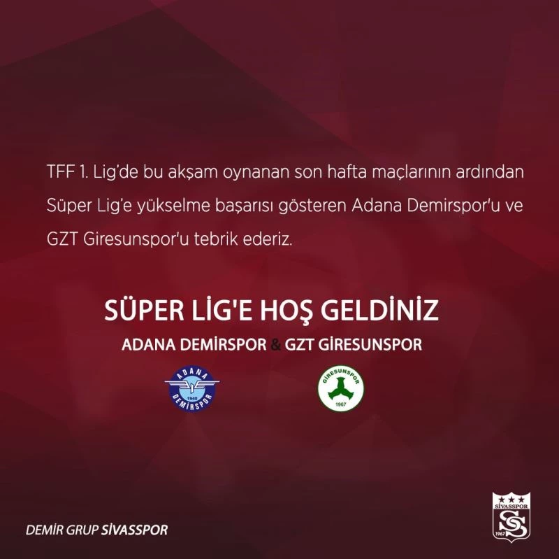 Sivasspor Kulübü resmi sosyal medya hesaplarından Süper Lig’e çıkmayı garantileyen Adana Demirspor ile Giresunspor’u tebrik ederek, Süper Ligde 2 takıma da başarılar diledi.