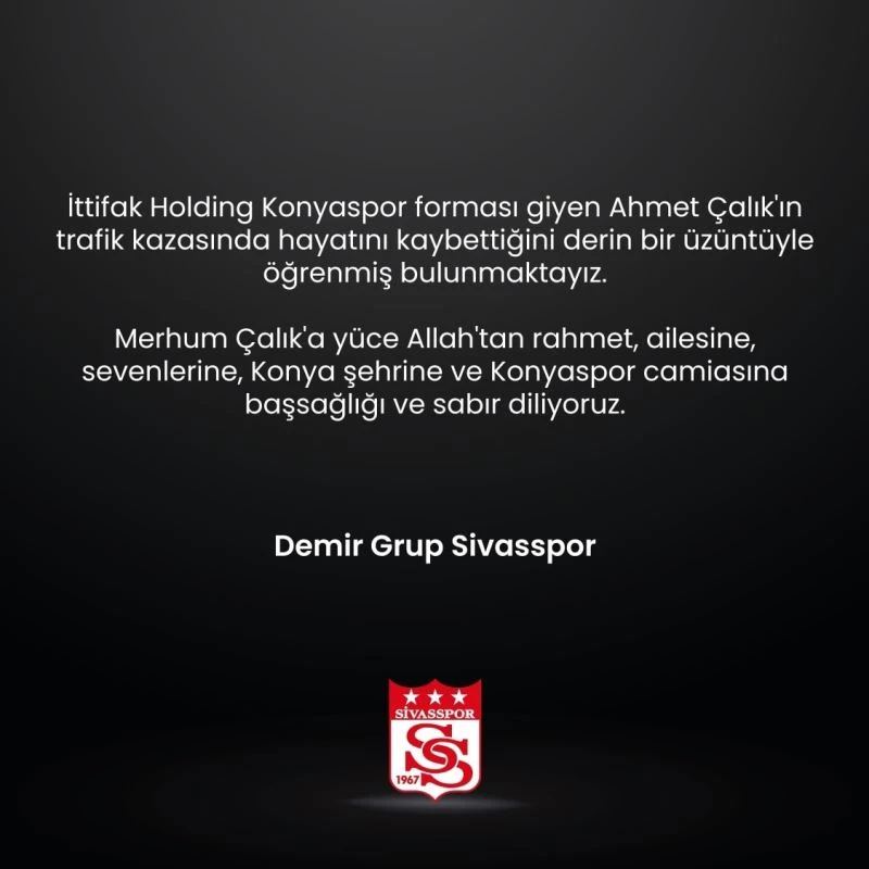 Geçirdiği trafik kazası sonucu hayatını kaybeden Konyasporlu milli futbolcu Ahmet Çalık için DG Sivasspor Kulübü’nden başsağlığı mesajı geldi.