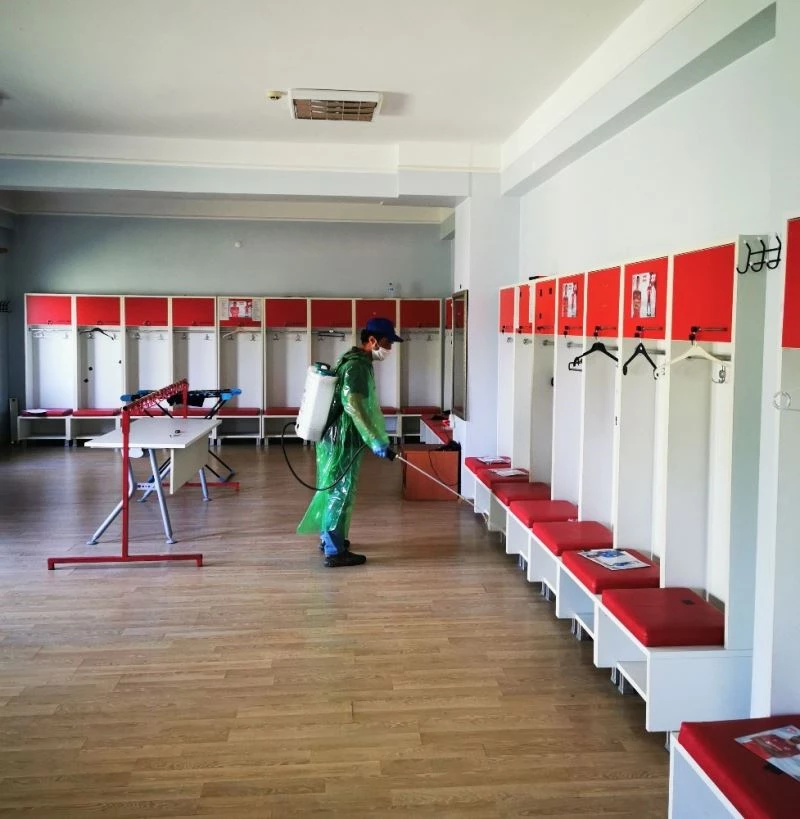 Bu kapsamda Sivasspor futbol A takım binasında bulunan; yatak odaları, soyunma odası, fitness salonunu, restoran, sağlık odaları, ortak dinlenme ve ibadet alanları ile tesis girişleri korona virüs salgını önlemleri kapsamında dezenfekte çalışması yapıldı.