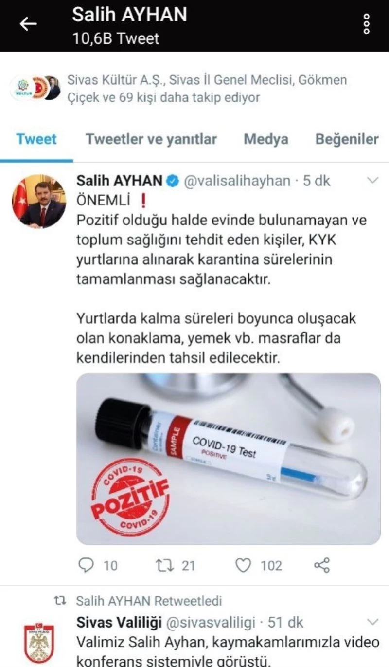Sivas Valisi Salih Ayhan, karantina kurallarını ihlal edenlerin, KYK yurtlarına alınarak yurtlarda devam edecek karantina süreci içerisindeki masraflarının kendilerinden tahsil edileceğini belirtti. Ayhan sosyal medya hesapları üzerinden yaptığı duyuruda, “Pozitif olduğu halde evinde bulunmayan ve toplum sağlığını tehdit eden kişiler, KYK yurtlarına alınarak karantina sürelerinin tamamlanması sağlanacaktır. Yurtlarda kalma süreleri boyunca oluşacak olan konaklama, yemek ve benzeri masraflarda kendilerinden tahsil edilecektir” ifadelerine yer verdi.