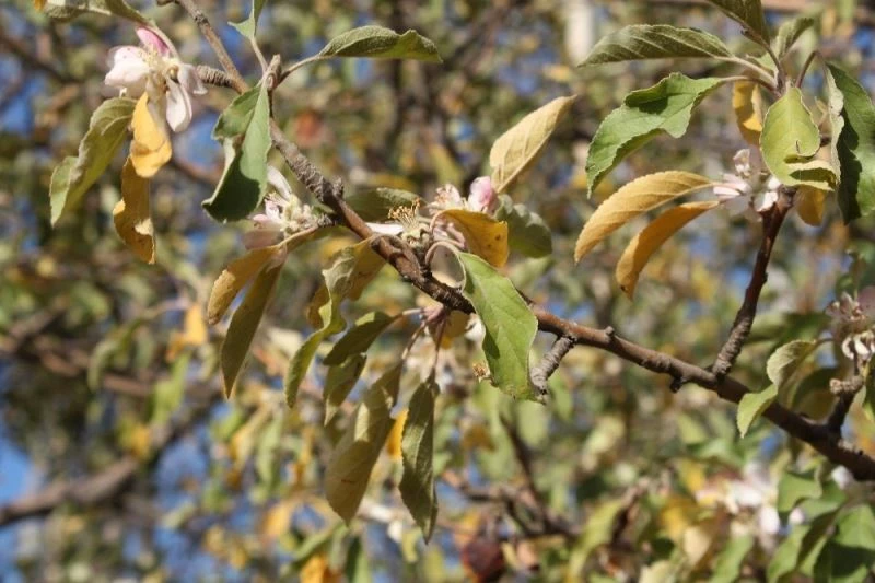 Sivas’ın Gemerek ilçesinde elma ağacının Kasım ayında çiçek açması görenlerin şaşkınlık yaşamasına neden oldu.